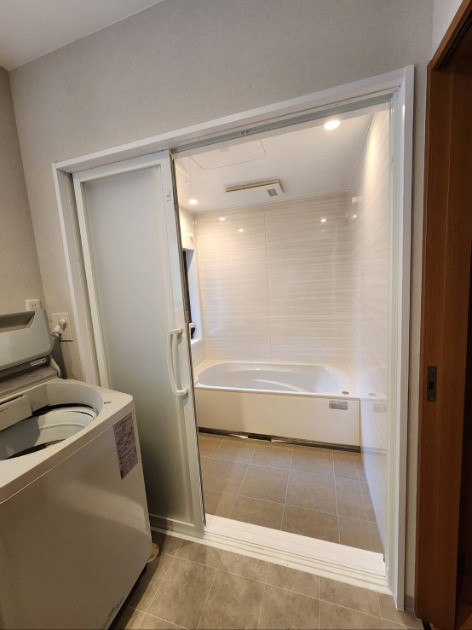 出入口を2枚引戸にして開口も広くなり、浴室からの光が入ってきてとても満足されています。