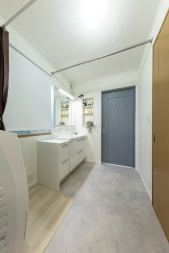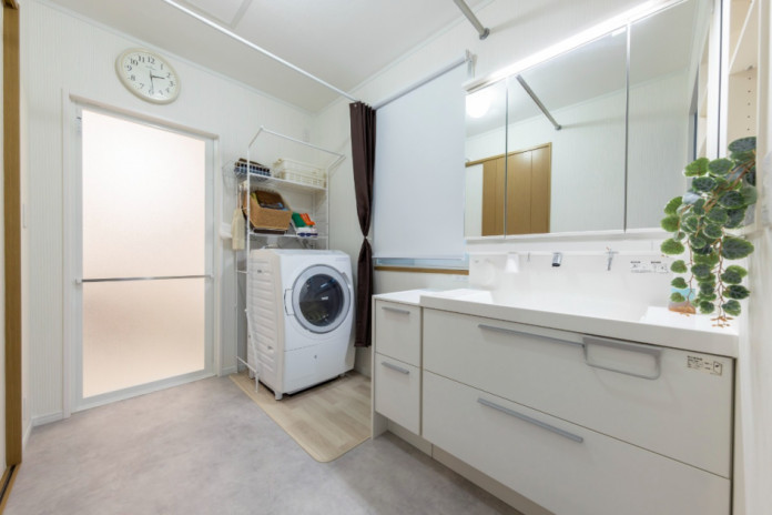 そこで、洗面台と洗濯機の位置を変え、洗濯機の前をカーテンで仕切ることで、誰かが入浴中でも気兼ねなく洗面室を利用できるようにしました。