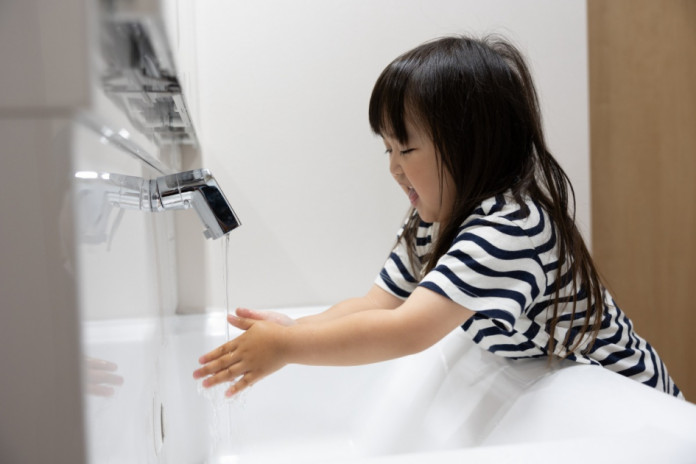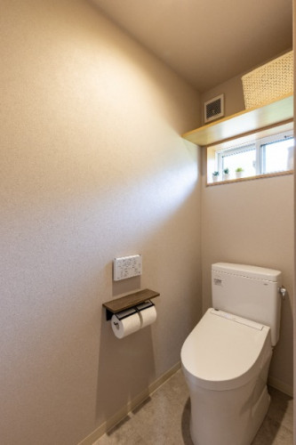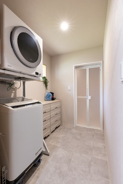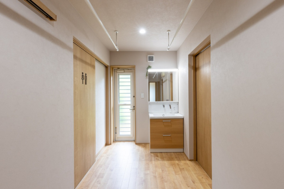 洗面化粧台は脱衣室の外に設置して、他の家族がお風呂に入っていても気にせずに洗面化粧台を使える配置にしています。