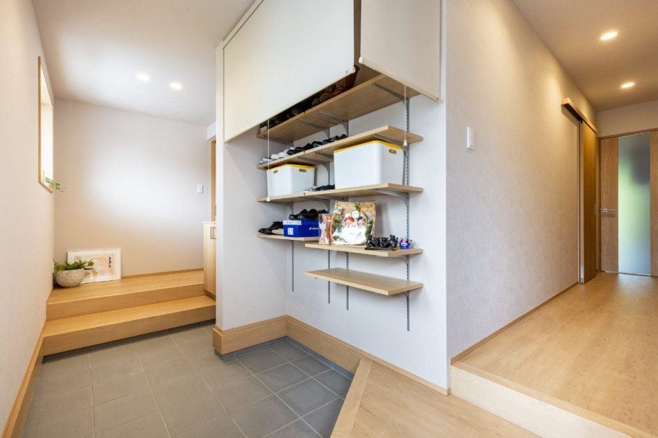 玄関を広げて、写真左手はLDKに繋がる入り口に、写真右手は洗面所に繋がる廊下へと、二つの動線を可能にしています。