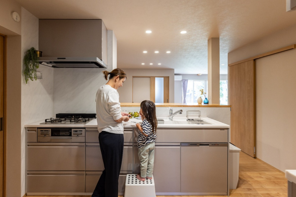 ママがキッチンに立つと「お手伝いする!」と自ら台を持ってくる娘さん。勢いあまって台を扉にぶつけても傷がつく心配がないので、娘さんの「やりたい」を尊重しながら楽しく調理ができます。