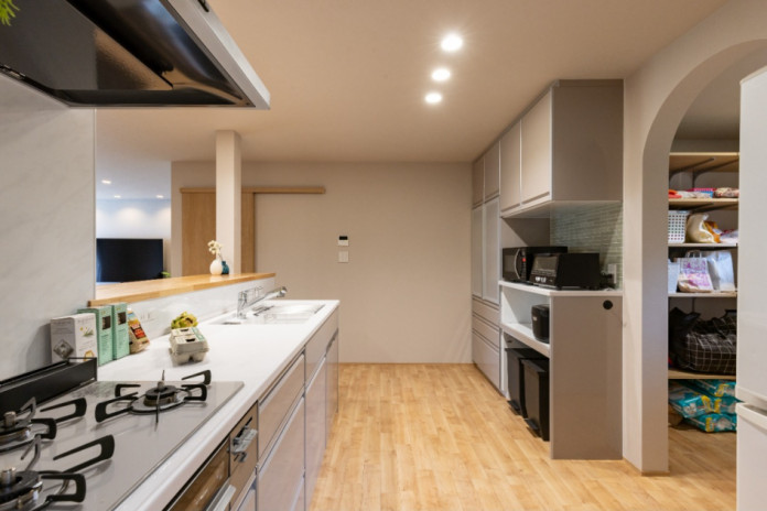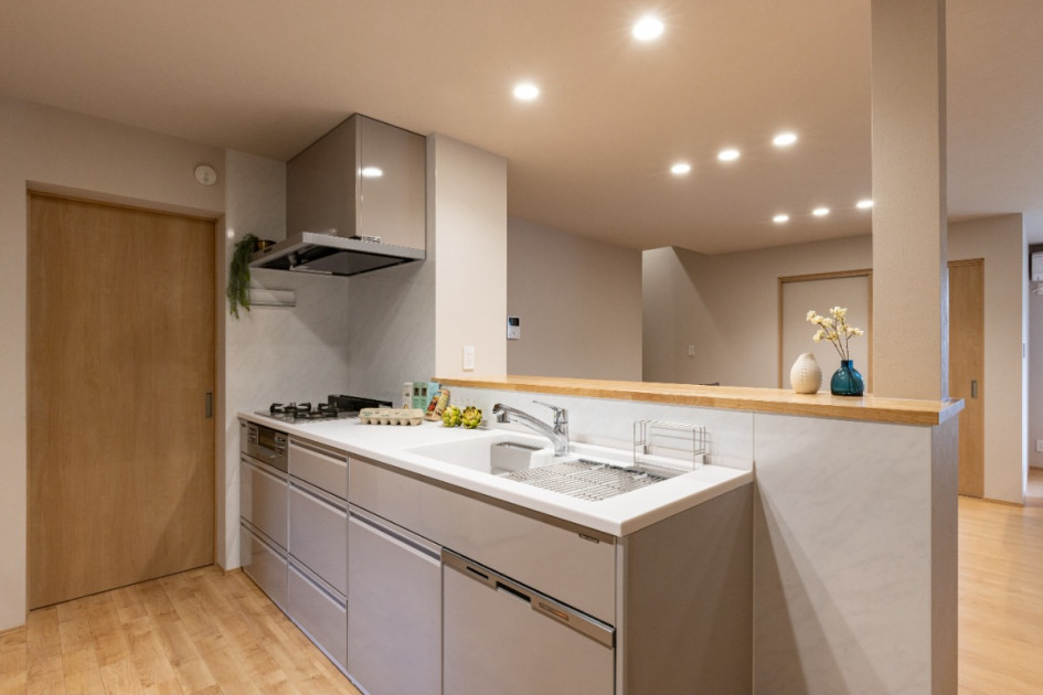 ゆったりとした広さのキッチンスペースは、調理中に後ろを他の家族が通ってもぶつかることなく安心です。