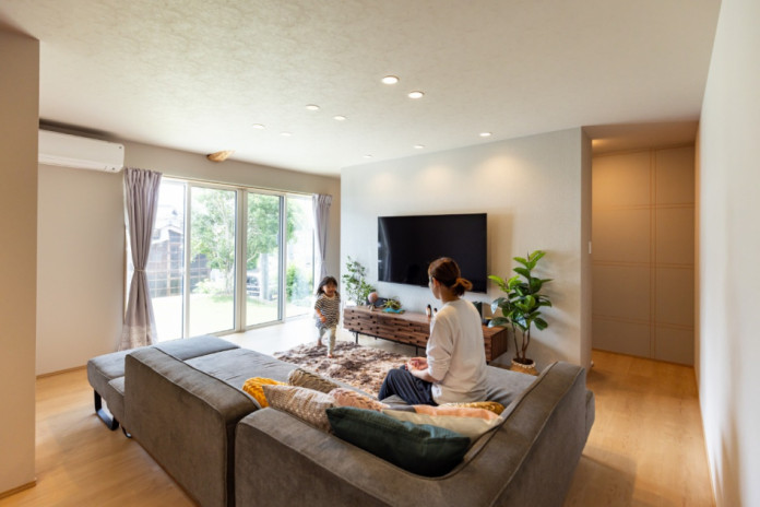 テレビの裏には、通り抜けられるウォークスルー収納を設置。家族それぞれの細々としたものを、まるっと収めることができる大容量収納スペースで、リビングが片づけやすくなっています。