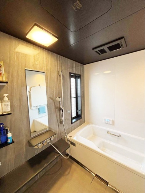 カウンター面と天井のパネルはシックな色で落ち着きのある大人のお風呂に。