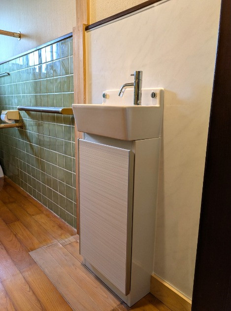 ☆トイレ手洗いは薄型でデザイン良く、背面のホーローパネルにマグネットが使え、見た目、機能性共に満足です。