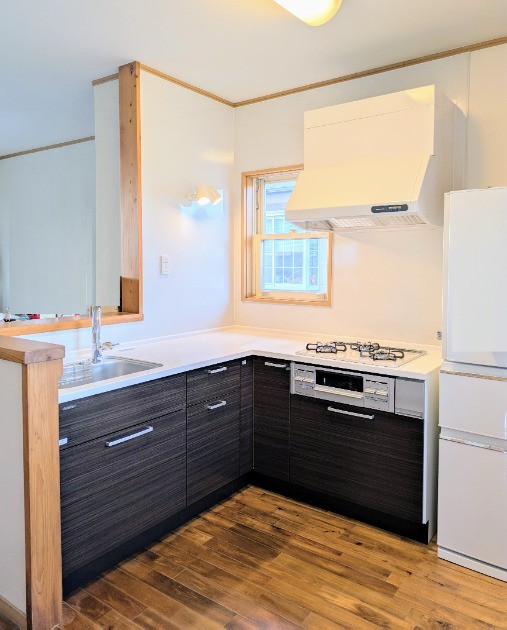 新築当初のキッチンが経年で使いづらくなられていたお客様。今回、思い切って“リフィット”を人造大理石天板のL型にてお選びになられ、おしゃれな“おうちカフェ”キッチンが完成しました。