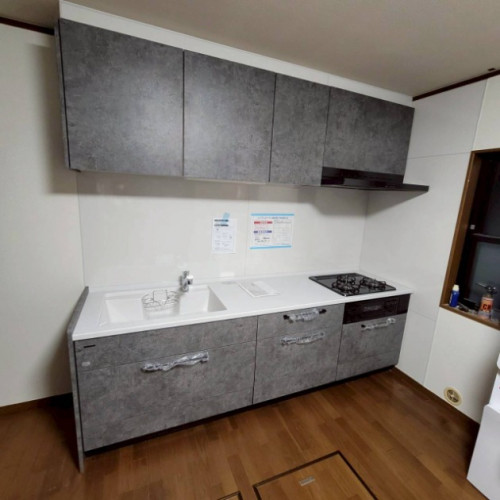 経年劣化したキッチンを一新し、ホワイト天板とグレートーン扉で高級感アップ