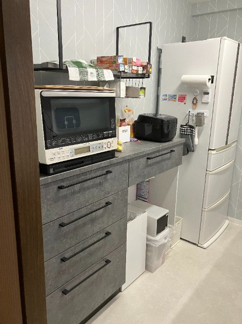 台所仕事がしやすい動線が最優先でした。シンプルな中でも高級感のある扉材はとても気に入りました。グレーが大好きなので扉罪によく合う北欧風の壁紙もとても気に入っています。シンプルに仕上げたことでこれからもいつまでも新鮮な気分で付き合えそうです。例えば、キッチンにいていつも????と感じるのがゴミ箱の置き場ですが、カウンター下にうまく、それも素敵に収まって良かったと思っています。