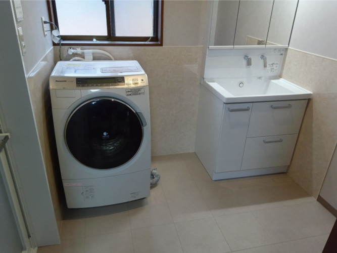 洗面台と洗濯機の間に余裕があり、洗濯や身支度の動作がスムーズに行えます。