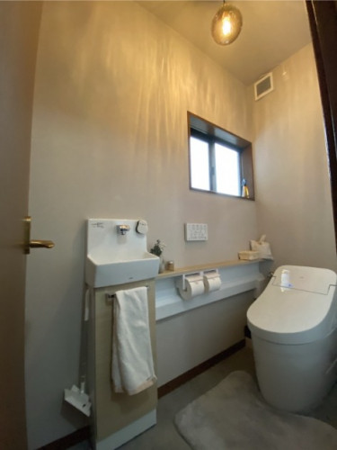 トイレ内に独立した手洗い器があり、すぐに手を洗えるのが便利。タオル掛けもあり、動線がスムーズです。