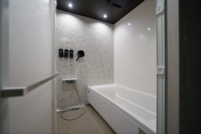 1坪のシステムバスに入れ替え、白とグレーを基調とした内装で、清潔感と落ち着いた印象を与えています。