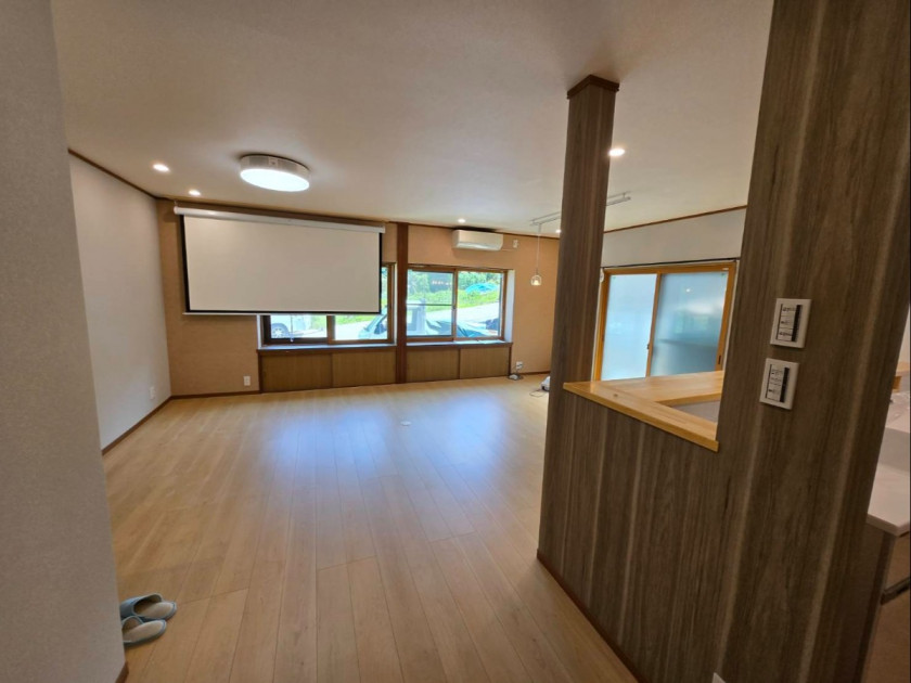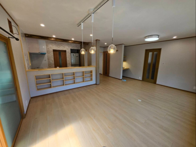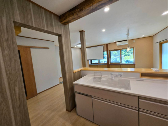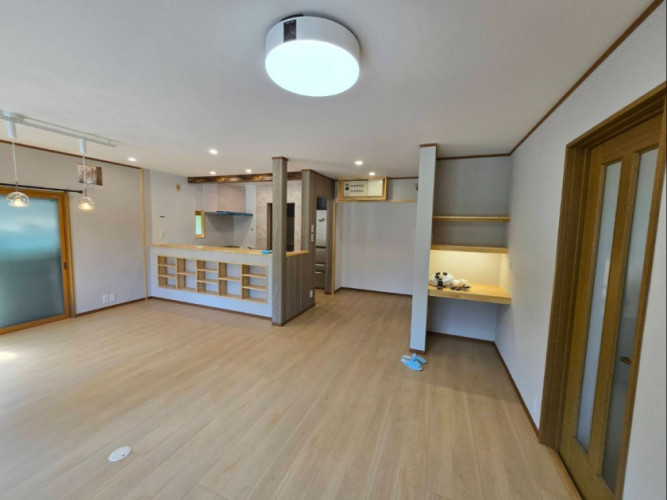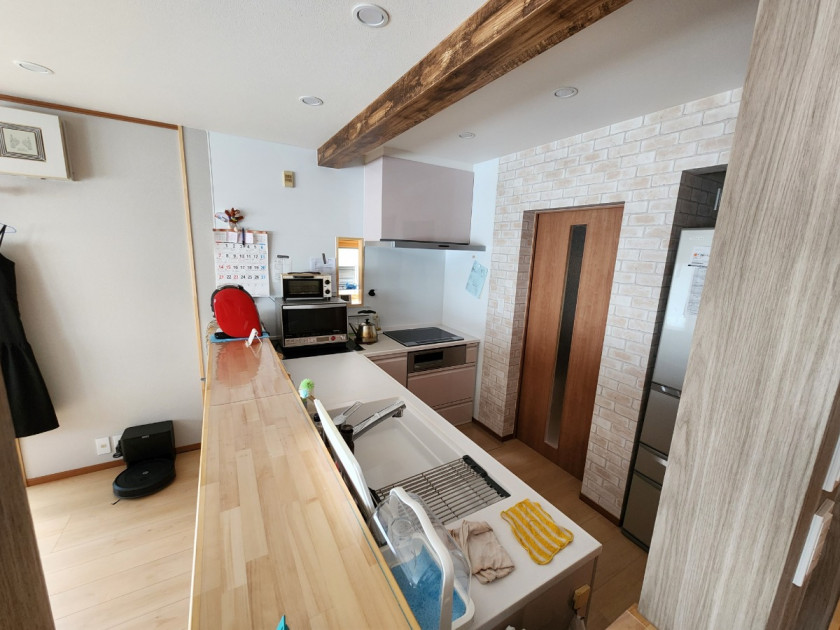背面から対面L型キッチンに変更したことと、間仕切りを取り除き2部屋を1部屋にして、リビング・ダイニング・キッチンのトータルな空間に仕上げました。