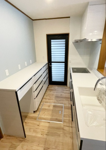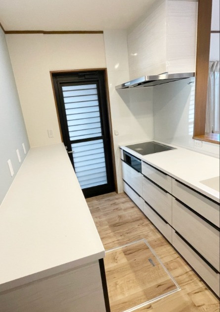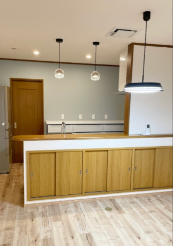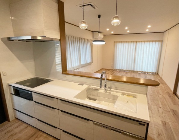 吊戸棚を撤去して、上部の壁を無くしました。「まるで新築のよう」キッチンからもリビングを見渡せる開放的な空間になりました。