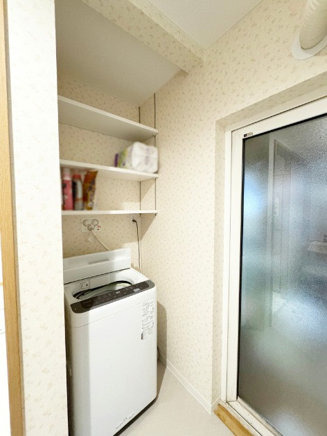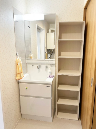 洗濯機上の可動棚で収納力を確保、家事もスムーズに