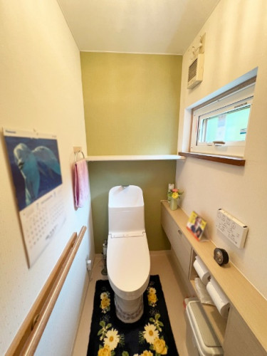 リフォーム前のトイレは収納が少なく雑多な印象がありました。今回、トイレ本体を交換し、不要だった手洗いを撤去することで空間をすっきりと改善。背面には棚と収納を設置し、生活用品を整理しやすくしました。さらにサッシと入口ドアも交換し、明るく快適な空間に。背面クロスをグリーンに張り替えることで、落ち着きとアクセントを兼ね備えた、心地よいデザイン性の高いトイレへと生まれ変わりました。
