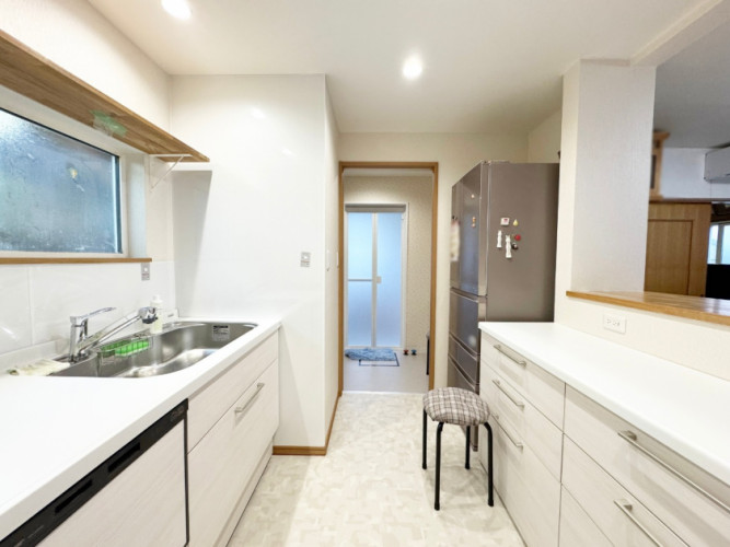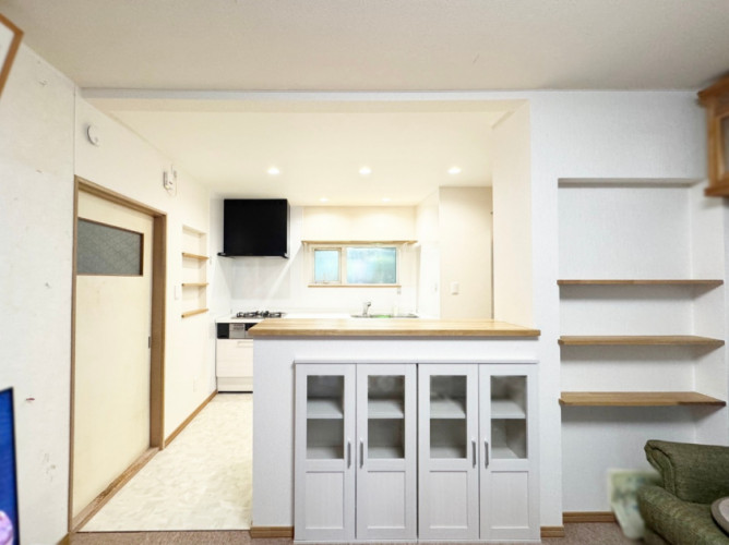 キッチン背面のリビング側に腰壁を造作し収納棚を埋め込み、日用品や小物をすっきり収められる空間に。さらにニッチ棚を設け、ディスプレイや実用的な収納として活用可能にしました。脱衣室では洗濯機の位置を変更し、キッチン幅を調整してスペースを確保。上部に可動棚を設置し、洗剤やタオルを効率よく収納できる快適な空間へ生まれ変わりました。
