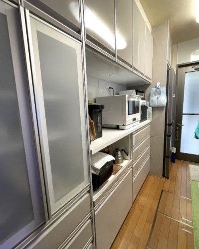 冷蔵庫上の収納と、となりの食器棚の高さを合わせて