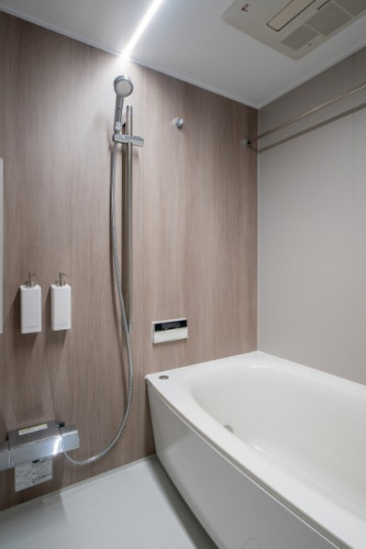 ユニットバスは、パナソニック i-x NSシリーズにリフォーム。スゴピカ素材 (有機ガラス系新素材) を採用し、汚れや水垢がつきにくい浴槽と、デザイン性が特徴です。