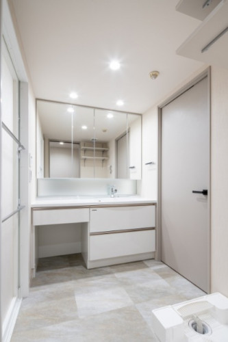 洗面台は、タカラスタンダードのリジャスト+造作でお作りしています。横幅1,500mmでゆったりとお使いいただけるサイズ感です。