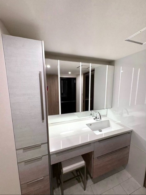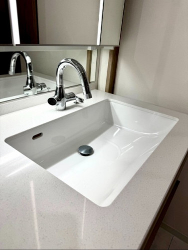 もともと大きな洗面台でしたが、大きな一面鏡で収納は少なめでした。