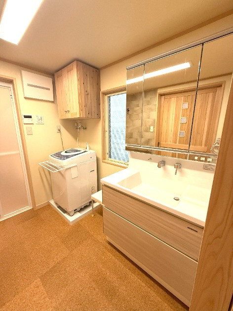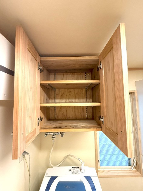 洗濯機の上に、当社大工手作りの無垢板の棚。