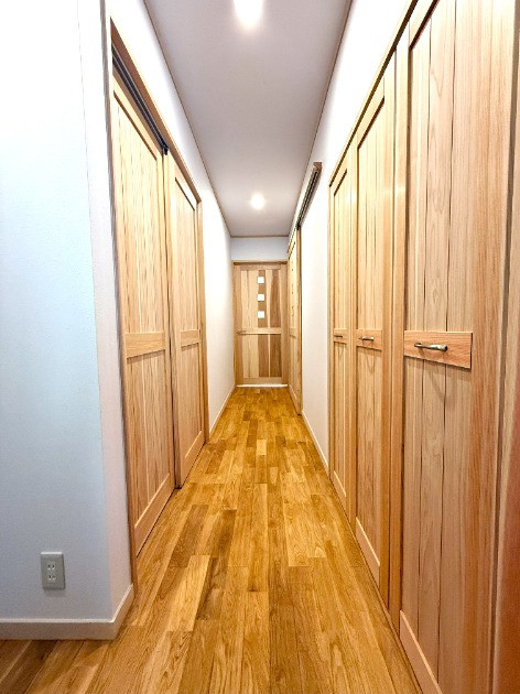 廊下の左右に引き戸を並べ、動線をシンプルにし、機能性高める。
