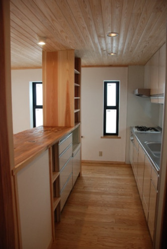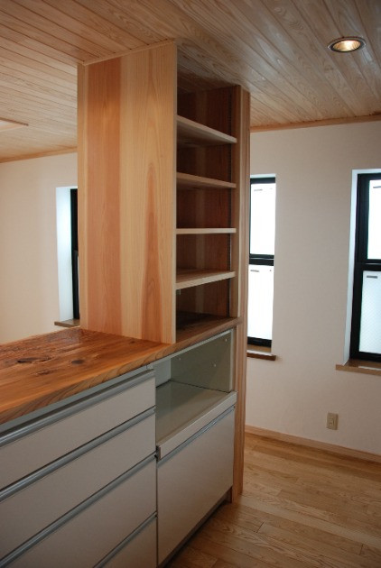 キッチンの収納棚の上に、大工の作りつけによる木の戸棚を設置。