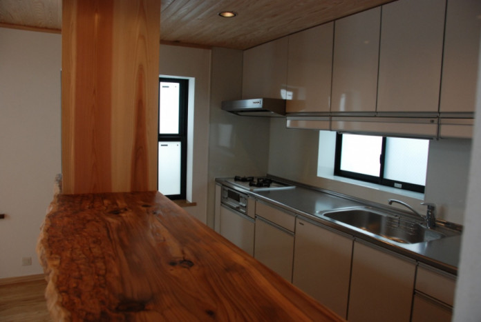 無垢板のカウンターは、長身の奥様に合わせた高さに。