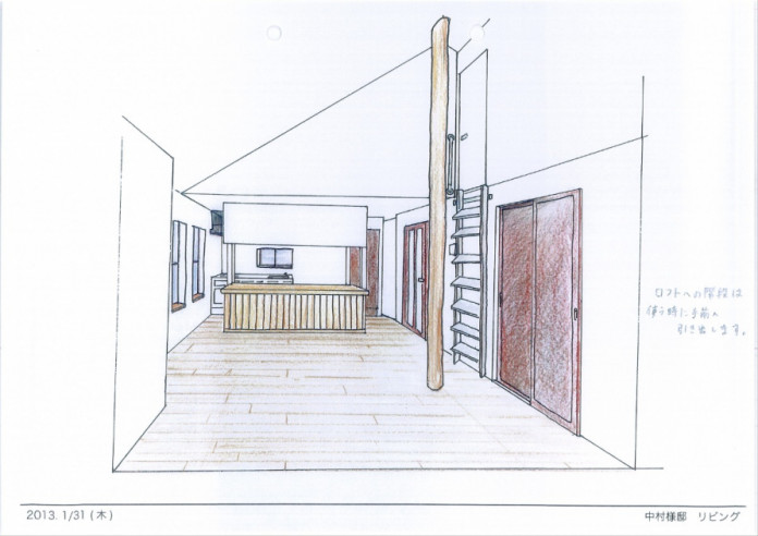 リフォーム案として、お施主様に見ていただいたキッチン・リビングの風景。