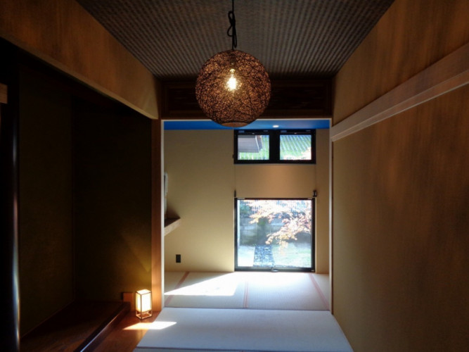 奥の縁側だった部分はあえて高さを下げて、天井のクロスには江戸時代に流行ったコバルトブルーを選んでメリハリを付けました。