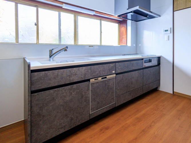 長年使い続けていたキッチンは設備の老朽化や収納不足により使い勝手にお悩みでした。リフォーム後は、落ち着いたグレーを基調としたシンプルでスタイリッシュなデザインのキッチンに。吊戸も失くし壁紙もキッチンパネルと合わせてホワイトにすることで窓からの明かりだけでも日中は明るいです。IHや食洗器を導入したことで調理の効率化とホーローのキッチンで油汚れもサッと拭き取れるためお手入れがしやすく広々と快適に使える空間へと生まれ変わりお客様にも大変ご満足いただいております。
