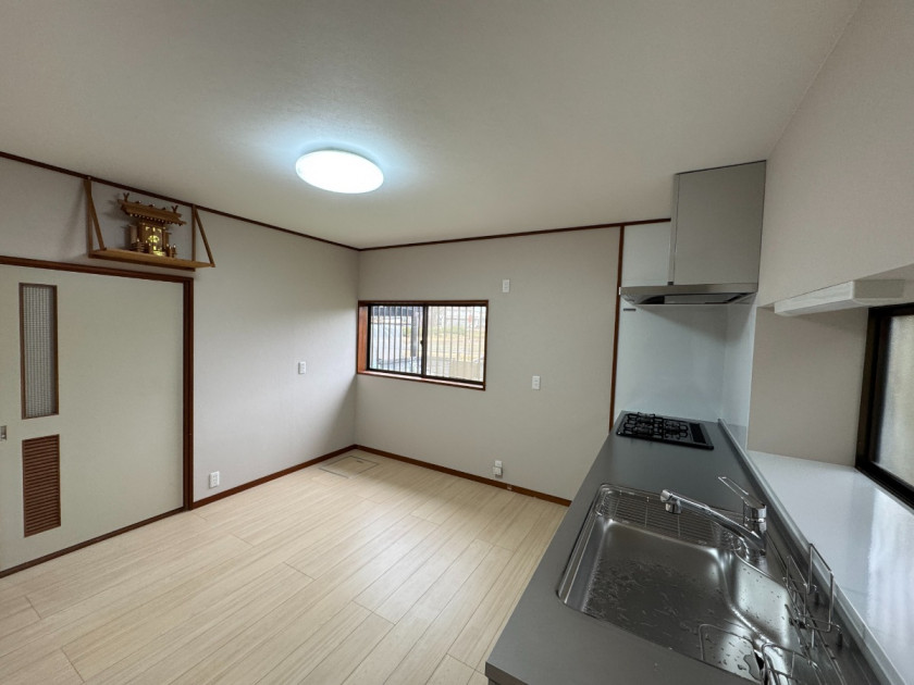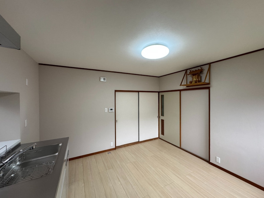 最終的に一部屋全体の天井・壁のクロス+床のフロア貼替えリフォームとなった。新しいキッチンとコーディネートしながら、明るく落ち着きのある空間に仕上がった。
