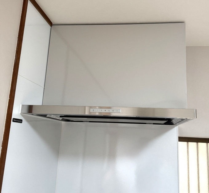 他メーカーと比較して特に気に入った、タカラオリジナルのホーロークリーンレンジフード!マグネット式でワンタッチで取り外せる整流板や、オイル受けなどがホーロー製でお手入れがラク。全面パネルは扉と同カラー、幅90cmを選んでサイズもぴったり納まった。