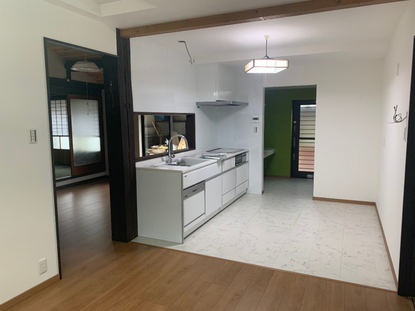 思い切って間仕切り壁を作り、キッチンと勝手口を離しました。キッチンと食事をするスペースを分けて、集まりやすいリビングダイニングへ生まれ変わりました。食事をするだけでなく、お友達を呼ぶ楽しみもできました。白いキッチンが映えて本当にきれいです。