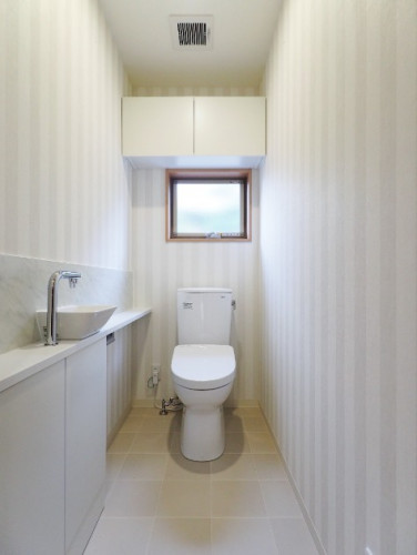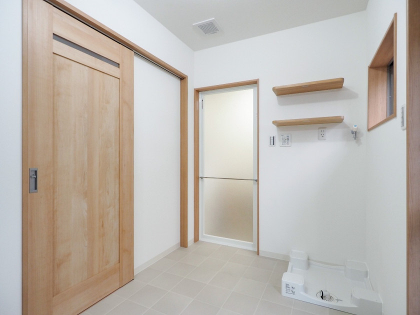 洗濯機置場には棚を設置し、洗剤が置けるスペースを確保。