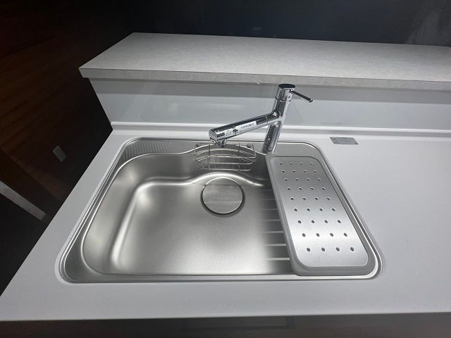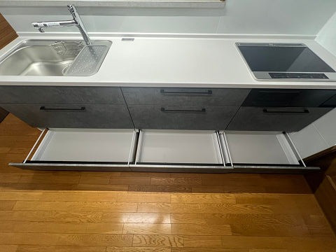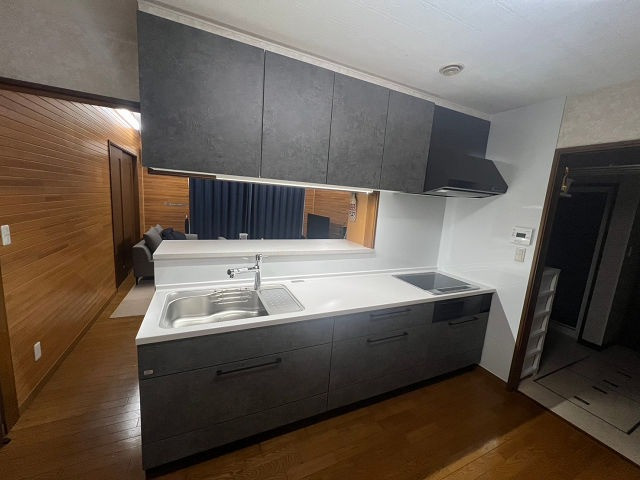 中古住宅を購入し、キッチンの汚れが掃除してもなかなか落ちず困っていました。そこで、汚れが簡単に落ちるタカラスタンダードのホーロー製キッチンに交換し、掃除の負担を軽減しました。また、お客様のご希望により「ディープグレー」のシックな色調のキッチンにしたことで、全体の雰囲気も一新されました。