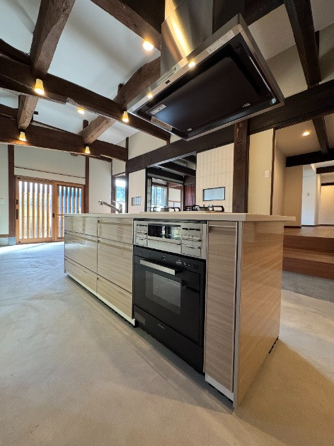土間キッチンを現代風に。高い天井には強さを感じる梁が。お料理が毎日楽しくなりそうです。