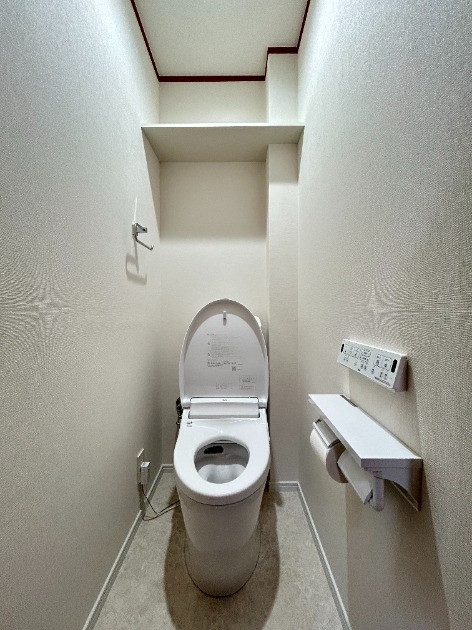 2階のトイレは右奥に柱型が有る為、珍しい右レバーの便器を採用。