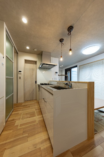 キッチンには、寝室への動線を確保し、回遊動線としました。