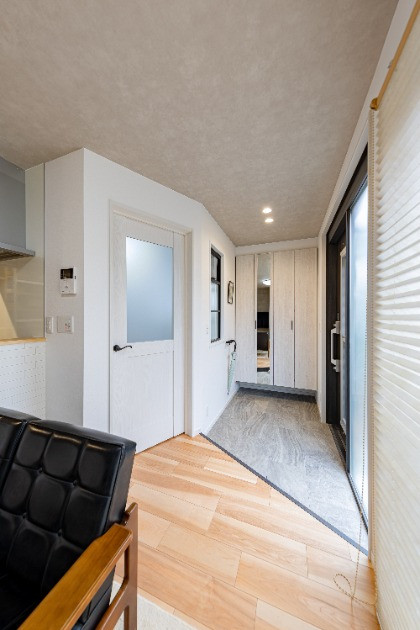 掃出し窓部分に玄関ドアを設置し、採光も確保。