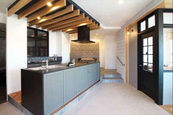念願だったオープンキッチンの向こうには、寝室へ繋がる扉が。
