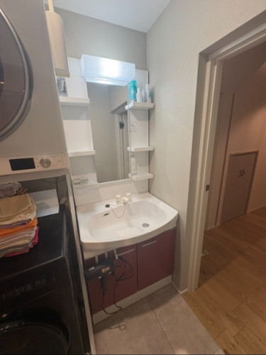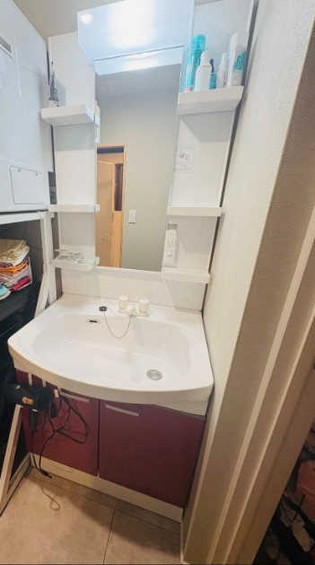 ワインレッドのカラーがアクセントとなり洗面室の中でもひときわ引き立つ洗面台にリノベーション