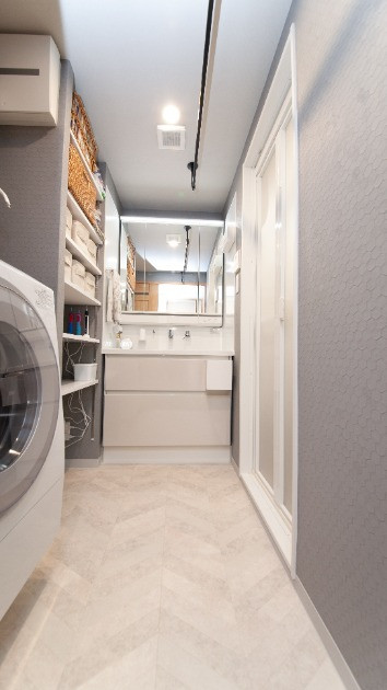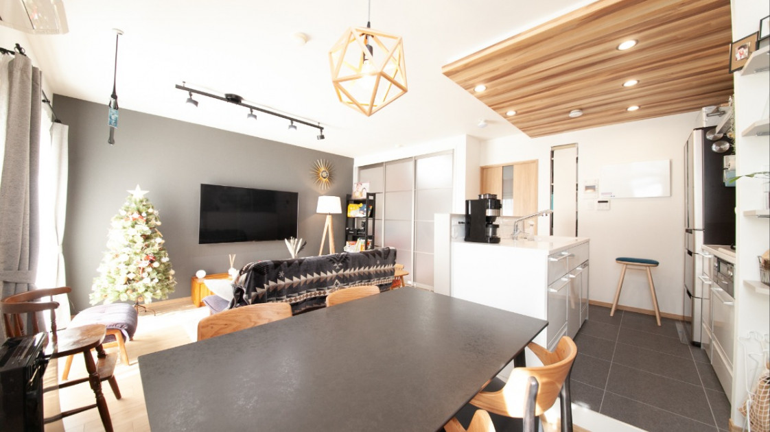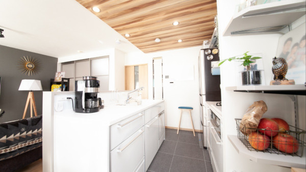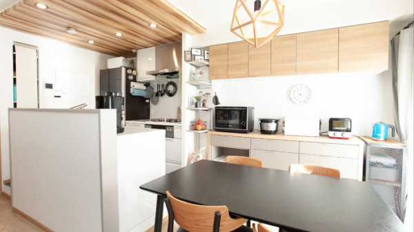 コンクリートの下地だった天井には、新たに照明の配線を取り入れるため、下がり天井にし、アクセントとなるよう木目調のクロスを貼り付けています。また配管の為に床上も行っているので空間として独立はしていますが、2列型を採用することによりLDKが一体的につながるよう仕上げました。