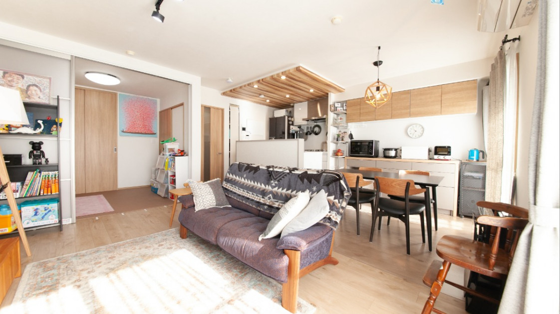 リビングに隣接した和室は、将来的にご夫婦の寝室として使えるようにベットの設置スペースを確保しつつ、LDKの拡張に取り入れました。将来性を見越し、可変性のある間取りに仕上げています。