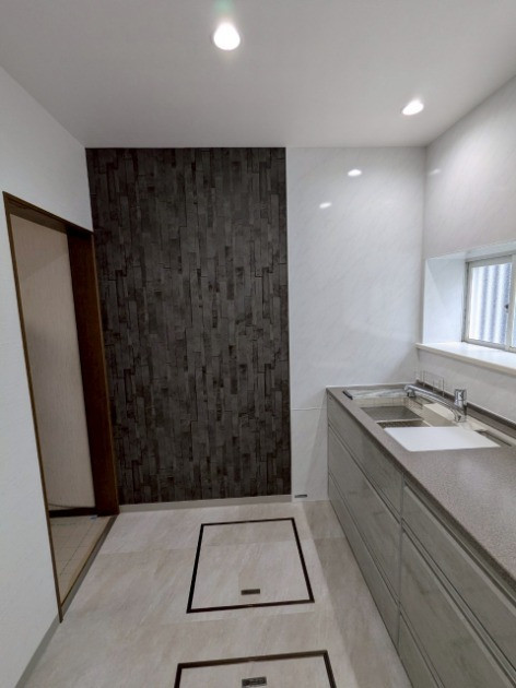 収納が少なくなった分はタカラスタンダードの収納力抜群のスライド収納タイプで補い、吊戸棚が無くなり広くなった天井にはダウンライトを4灯配置致しました☆