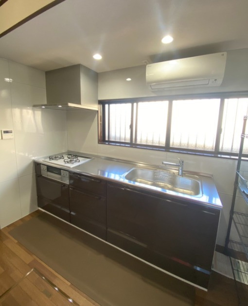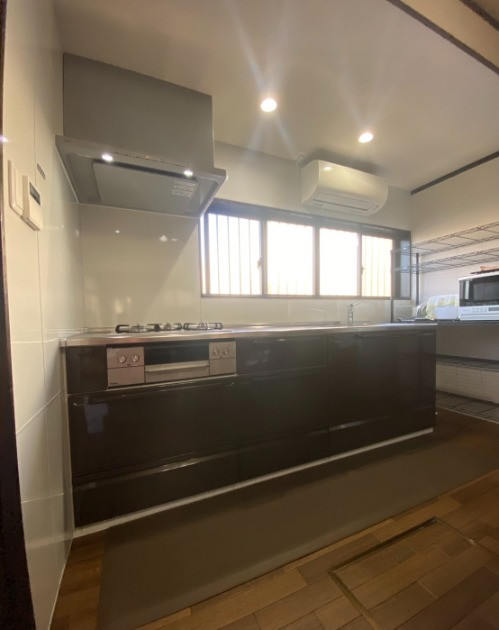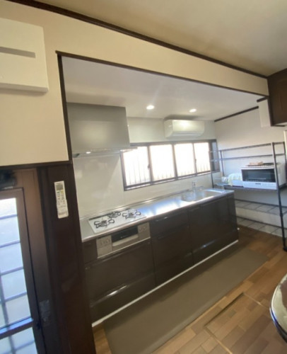 小型湯沸器を撤去し外部から給湯配管を新設、またルームエアコンがレンジフードすぐ横に配置されていた為、設置場所を安全な位置に移設致しました。