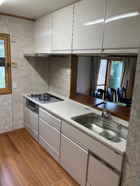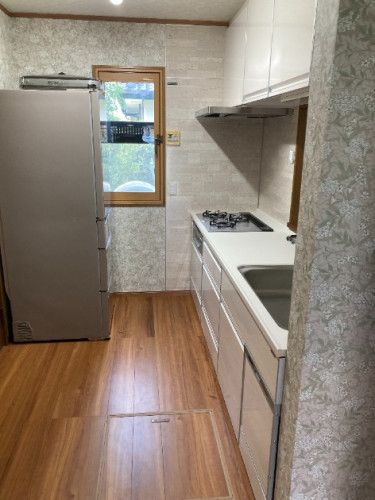 キッチン前に据え置き式の食洗機と浄水機がありましたが、両方ともビルトインにし、カウンターも研磨して再塗装しました。お施主様が石目調のキッチンパネルがあったので、色調がおなじでボタニカル柄のクロスをご提案しました。あえてキッチンの扉はシンプルな面材にしたので、全体的に落ち着きながらも個性的なデザインになったと思います。