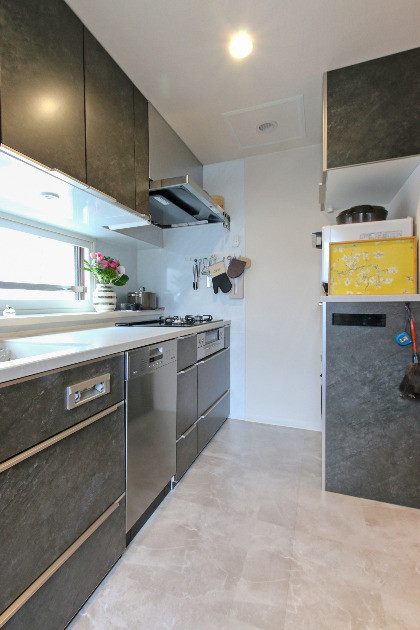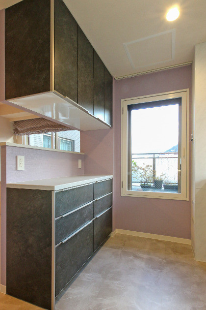 I型にしたことで背面に収納を追加でき、デッドスペースがなくすっきりと使えるキッチンに。