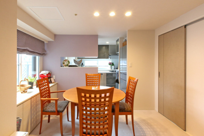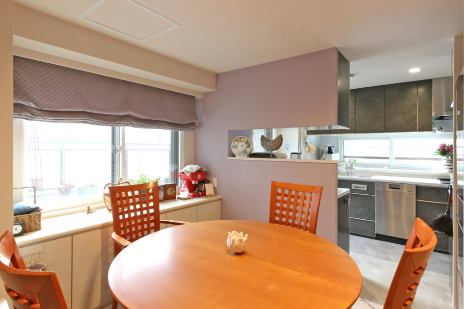 また、壁を奥様のお好きなカラーのクロスでダイニング側に柔らかなアクセントをつけています。