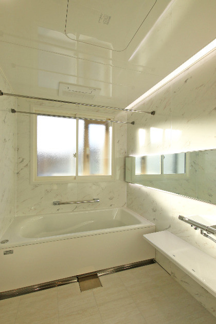 横長のミラーで空間の広さを強調し、すっきり清潔感のある浴室空間としました。